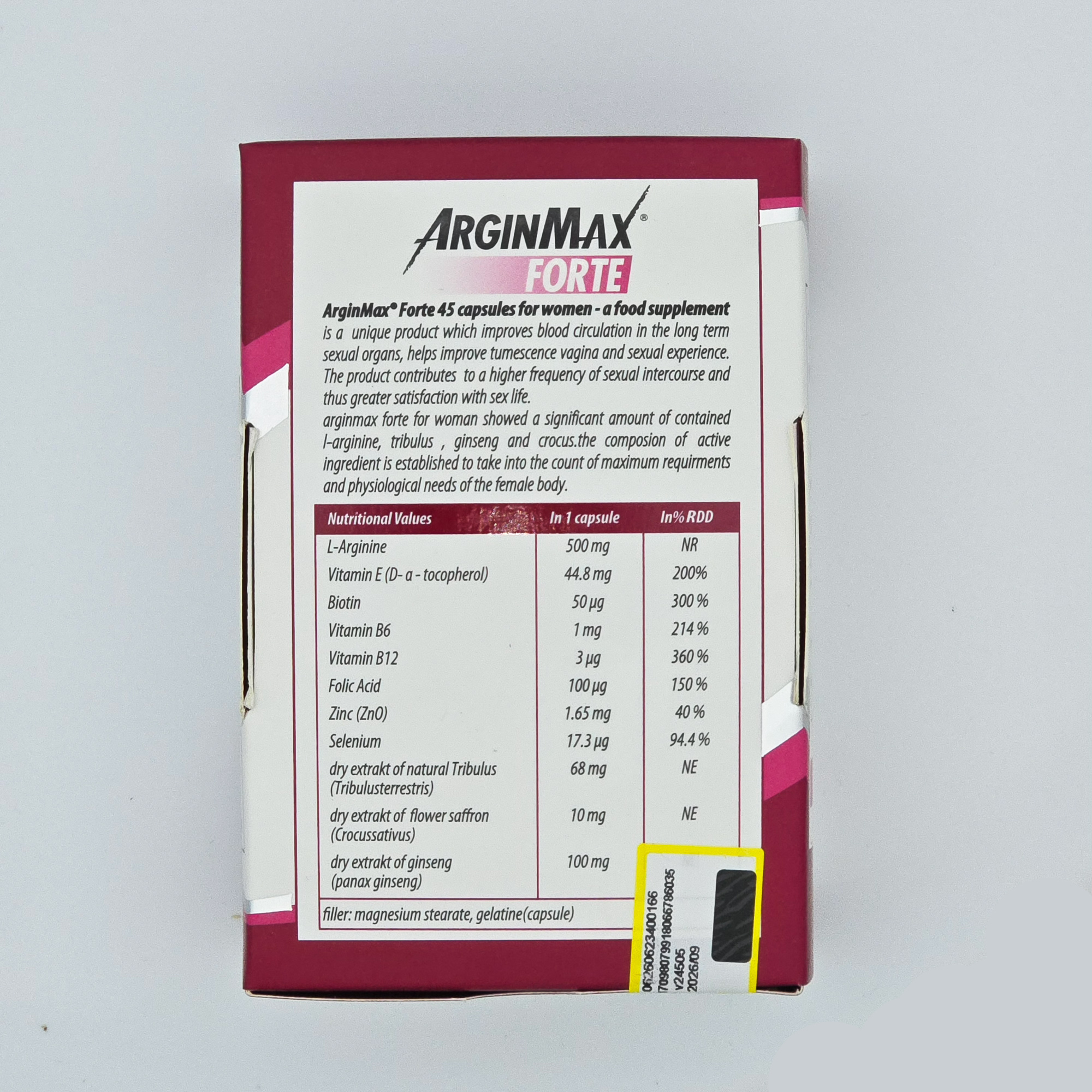 آرژین مکس بانوان فرآورده طبیعی حاوی ال آرژنین، ویتامینهای گروه B، E، زینک، سلنیوم، عصاره خارخاسک، زعفران و جینسینگ است. آرژین مکس میتواند سبب افزایش قوای جنسی و بهبود باروری در بانوان شود.