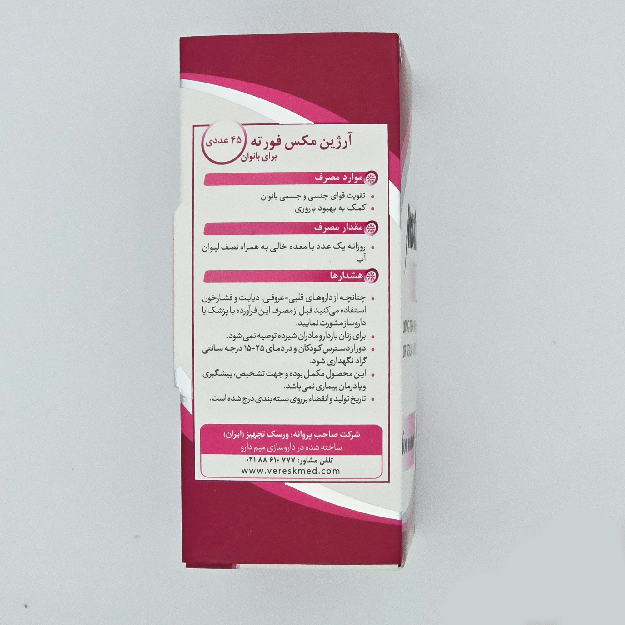 _ آرژین مکس فورته برای بانوان، فرآورده طبیعی، حاوی ال آرژنین، ویتامین های گروه B، ویتامین E، زینک، سلنیوم و عصاره _ گیاهان خارخاسک، عصاره زعفران و جینسینگ