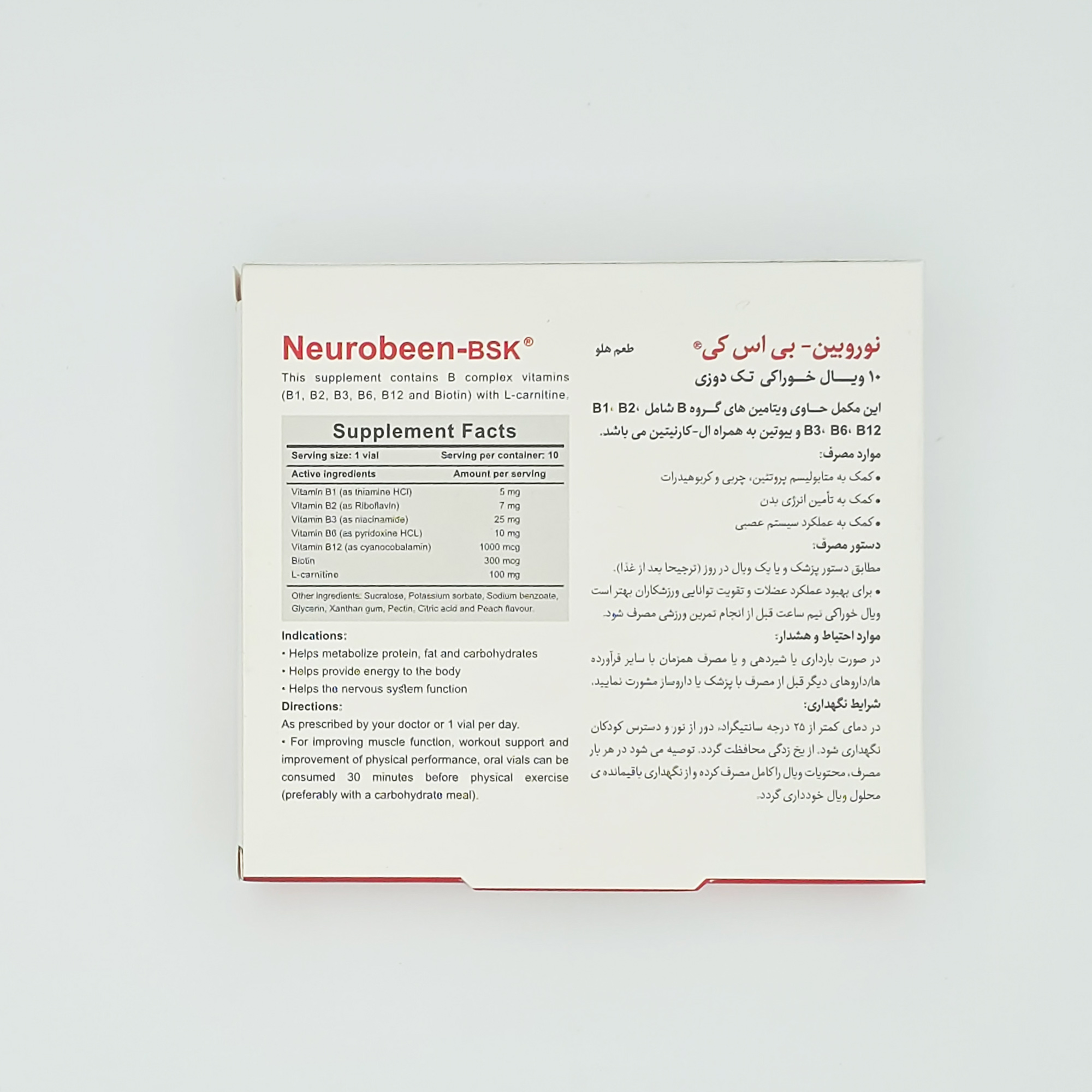 _ محلول خوراکی نوروبین، ب کمپلکس حاوی 10 ویال خوراکی تامین کننده ویتامین های گروه B (B1، B2، B3، B6، B12 و بیوتین) به همراه ال-کارنیتین