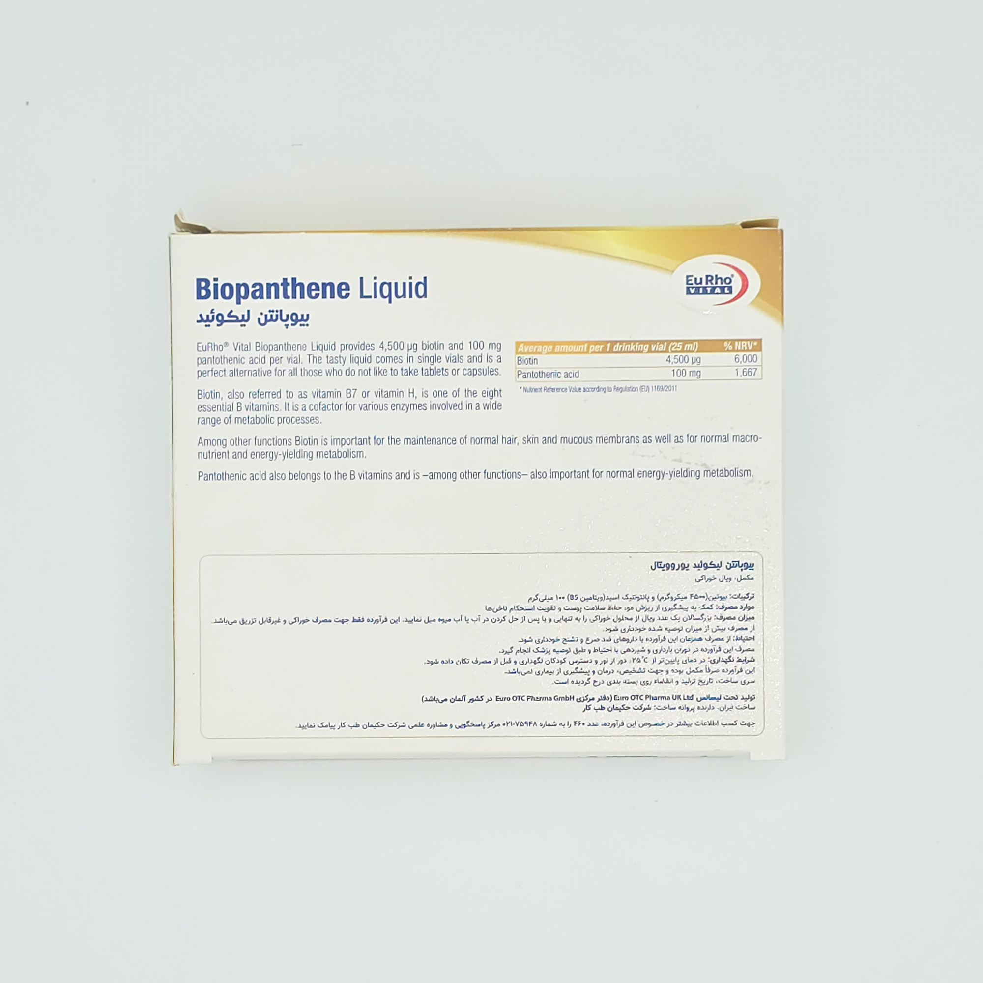 هر ویال بیوپانتن لیکوئید یوروویتال حاوی 4500 میکروگرم بیوتین است.