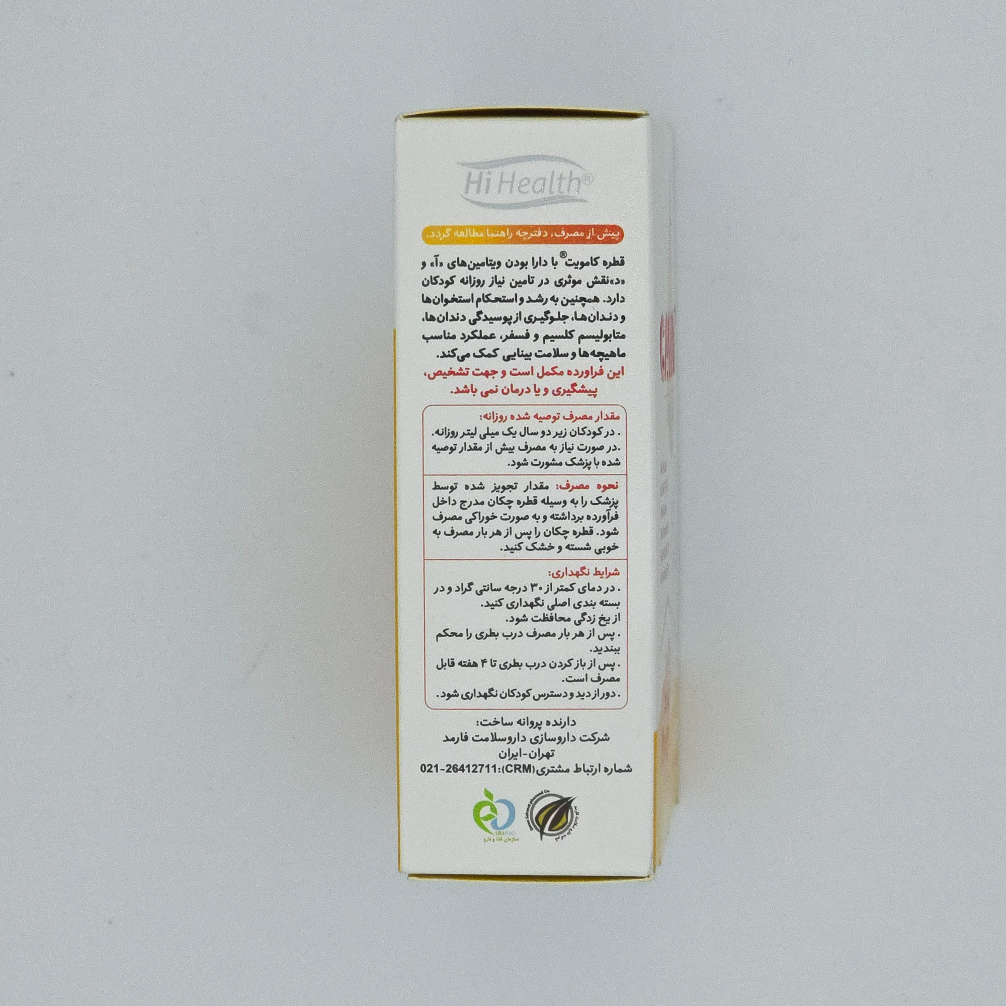 قطره کامویت یک مکمل غذایی حاوی 1500 واحد بین المللی ویتامین A و 400 واحد بین المللی ویتامین D به ازای هر میلیلیتر است که بهمنظور تامین نیاز روزانه به این دو ویتامین از بدو تولد تا پایان دوسالگی طراحی شده است. قطره کامویت به رشد و استحکام استخوانها و دندانها، متابولیسم طبیعی کلسیم و فسفر، عملکرد طبیعی عضلات، حفظ سلامت سیستم بینایی و رشد و تکامل مناسب ذهنی و فیزیکی کمک میکند. قطره آد کامویت به فرم دارویی قطره در بطری شیشهای قطرهچکاندار 30 میلیلیتری توسط شرکت دارو سلامت فارمد تولید میشود. کامویت فاقد پارابن، BHT و BHA، گلوتن، طعم دهنده و رنگ مصنوعی و هرگونه مواد نگهدارنده است.