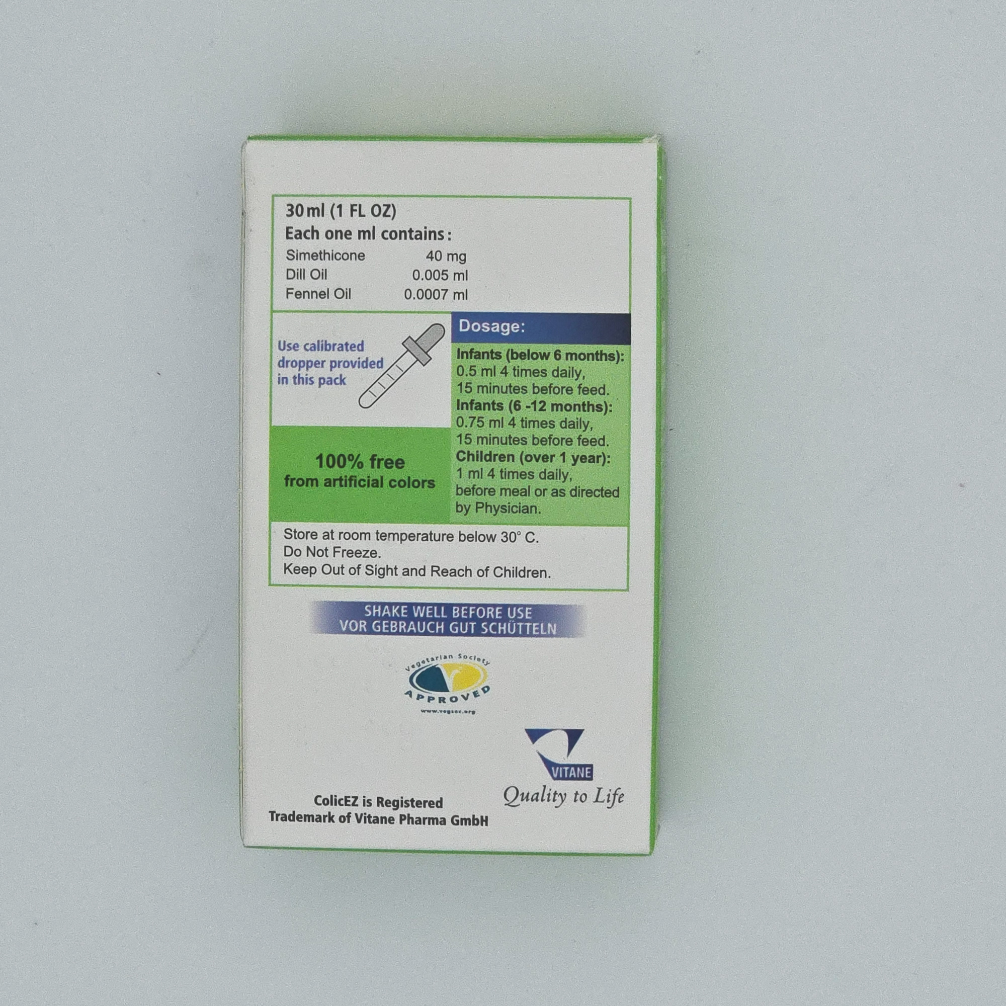 - سایمتیکون: قطره کولیک ایز حاوی سایمتیکون است که به دفع گاز محبوس شده در روده و معده نوزادان کمک می کند. اثربخشی آن در قولنج نوزاد، سوء هاضمه و کاهش درد ناشی از احتباس گاز در روده ثابت شده است. این ترکیب به عنوان داروی ضد نفخ مورد تایید سازمان غذا و داروی آمریکا است.