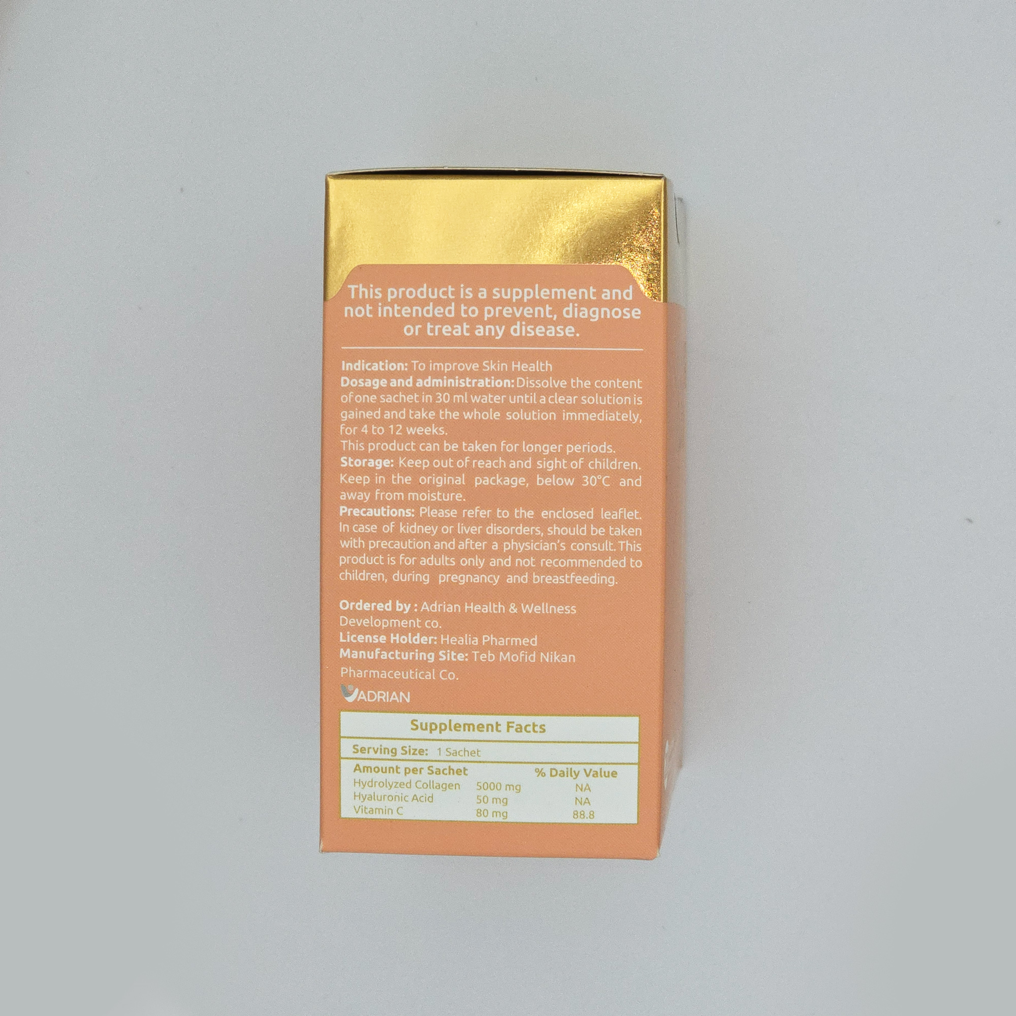 پودر کلاژن گلد آدریان، یک مکمل غذایی تخصصی برای جوان سازی و حفظ سلامت پوست می باشد. پودر کلاژن گلد به صورت "ساشه" و در بسته بندی هایی 20 عددی قابل تهیه می باشد. ساشه کلاژن چیست؟ ساشه کلاژن در واقع همان پودر کلاژن می باشد که بر اساس دوز مصرف استاندارد آن، در کیسه های کوچک و یک بار مصرف بسته بندی شده است. پودر کلاژن آدریان حاوی 5000 میلی گرم هیدرولایزد کلاژن، 80 میلی گرم ویتامین C به اضافه 50 میلی گرم هیالورونیک اسید می باشد. وب سایت داروکده دارای خدماتی همچون مشاوره قبل، حین و پس از خرید محصولات می باشد. جهت اطلاع از قیمت پودر کلاژن گلد یا قیمت ساشه کلاژن گلد، نحوه مصرف پودر کلاژن، تداخلات و عوارض ساشه کلاژن، می توانید از امکانات مشاوره آنلاین و تلفنی داروکده استفاده نمائید.