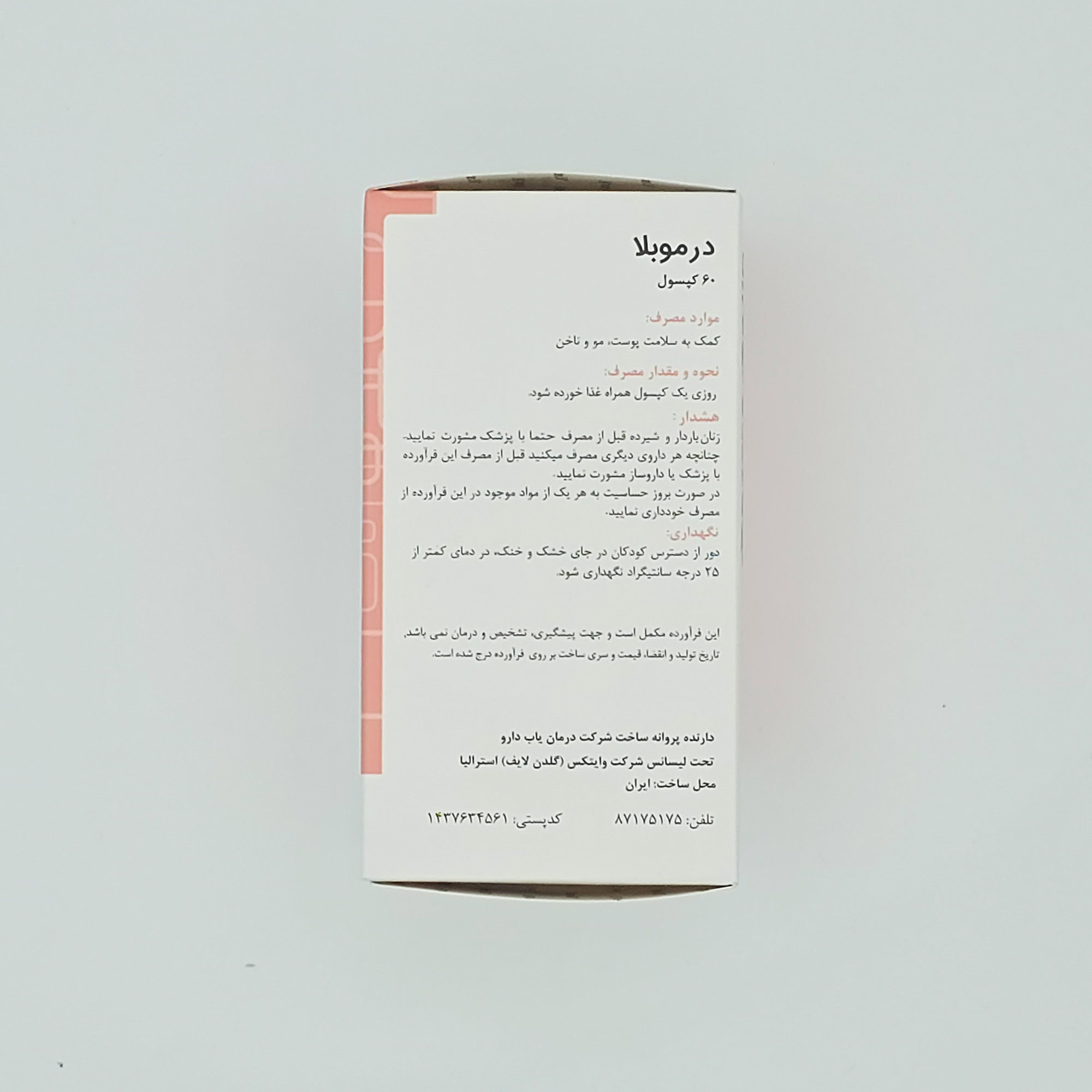 درموبلا دارنده پروانه ساخت شرکت درمان یاب دارو ایران و تحت برند شرکت وایتکس (گلدن لایف) استرالیا در بسته بندی 30 و 60 عددی تولید و عرضه شده است. فرم دارویی این مکمل در واقع کپسول بوده اما به عنوان قرص درموبلا نیز در بین عموم مردم شناخته شده است.