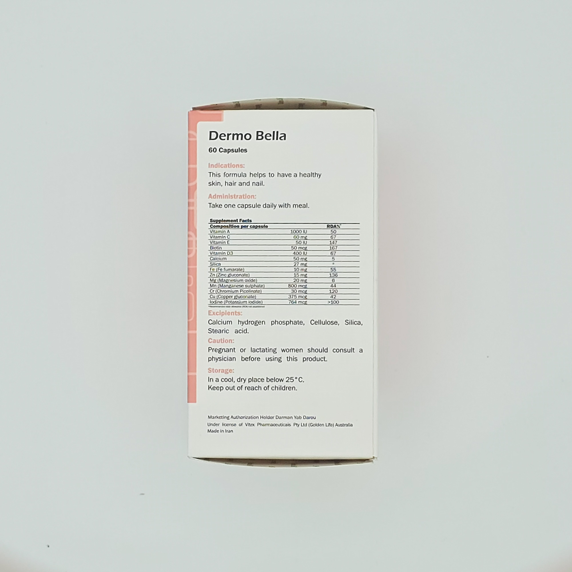 ترکیبات قرص dermo bella شامل ویتامین ها (ویتامین A، ویتامین C، ویتامین E و ویتامین D و بیوتین)، مواد معدنی (کلسیم، زینک گلوکونات، پتاسیم یدید، آهن فومارات، منیزیم اکساید، سولفات منگنز، کروم پیکولینات و گلوکونات مس) و سیلیکا در مقادیر مناسب برای حفظ سلامت پوست، مو و ناخن است.
