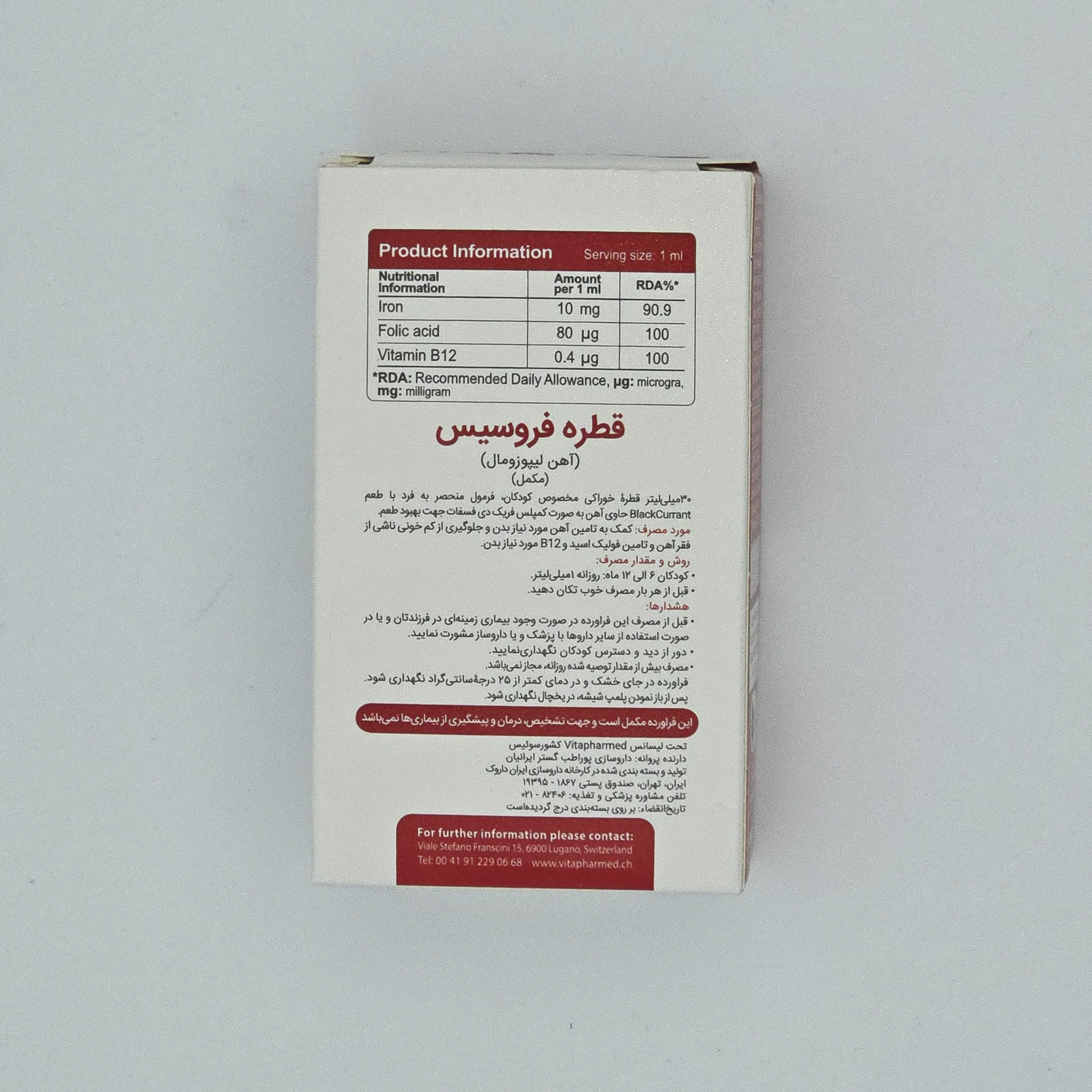 قطره فروسیس توسط شرکت ایران داروک و تحت برند شرکت Vitapharmed کشور سوئیس تولید و بسته بندی میشود.