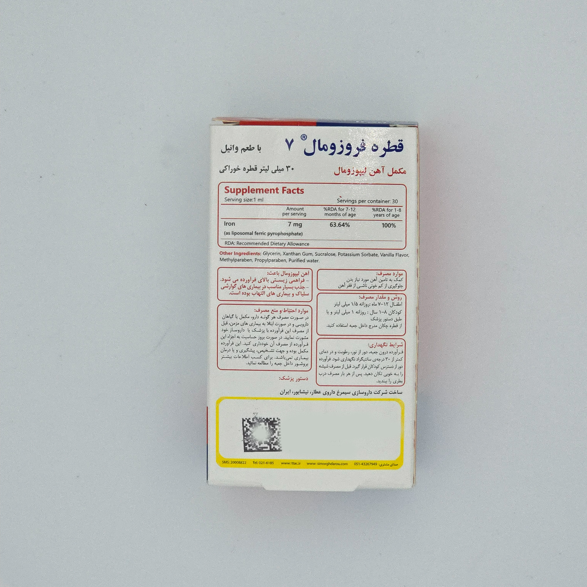 قطره آهن فروزومال 7 میلی گرم شرکت داروسازی سیمرغ داروی عطار، در هر میلی لیتر خود فراهم کننده 7 میلی گرم آهن به فرم لیپوزومال در راستای تامین آهن مورد نیاز برای پیشگیری از کم خونی و کمک به رشد و تکامل بهتر نوزادان از 7 ماهگی می باشد. آهن فروزومال 7 به دلیل تکنولوژی ویژه بکار گرفته شده در فرمولاسیون خود، زیست فراهمی بالایی داشته و به دلیل عدم تماس مستقیم با دندان و پوشش دستگاه گوارش، باعث ایجاد طعم ناخوشایند در دهان، سیاه شدن دندان ها و عوارض رایج گوارشی حاصل از آهن در شیرخواران نمی شود. قطره آهن فروزومال 7 سیمرغ داروی عطار، به فرم دارویی سوسپانسیون در بطری های شیشه ای قطره چکان دار 30 میلی لیتری با طعم مطلوب وانیلی طراحی و به بازار عرضه شده است.