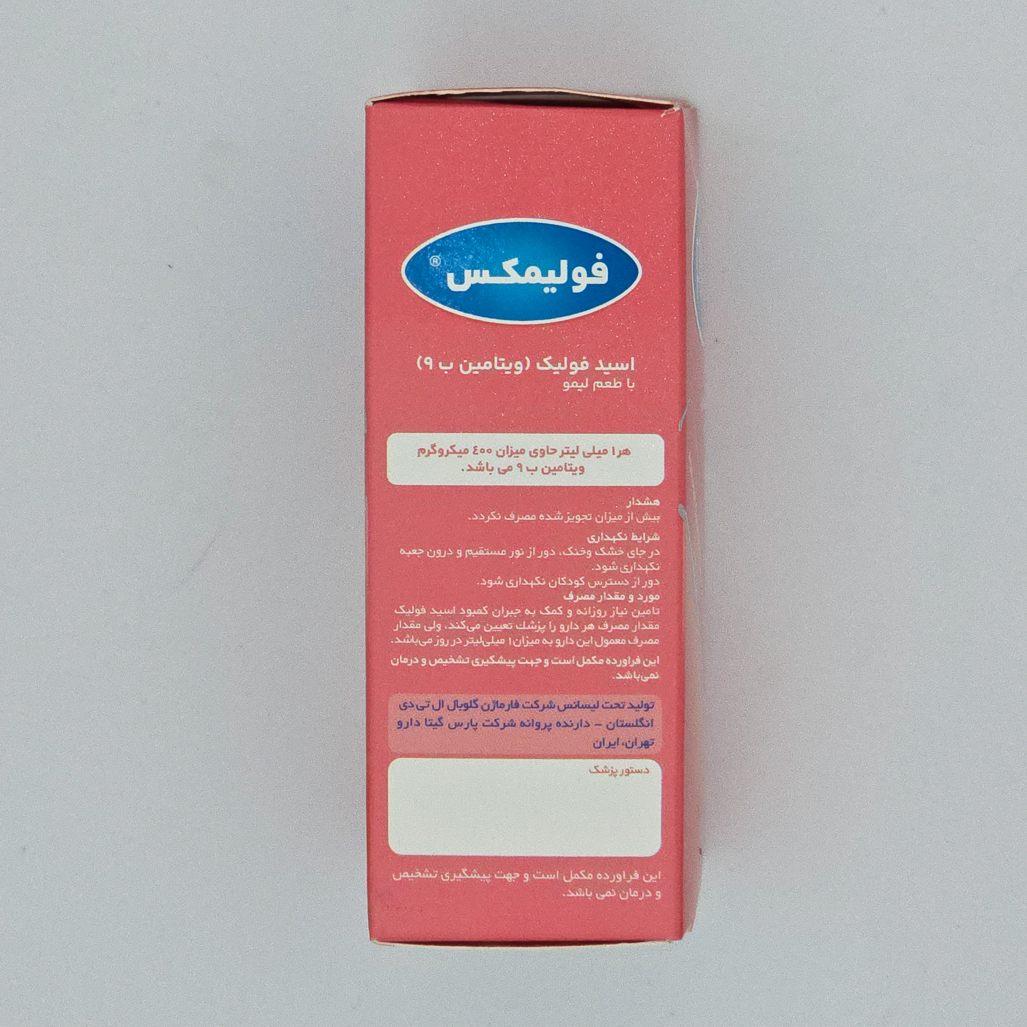 فولیمکس قطره حاوی فولیک اسید، تحت امتیاز و لیسانس شرکت آلتن PPG انگلستان است و با پروانه شرکت پارس گیتا دارو در ایران تولید میشود. قطره فولیمکس جهت تامین ویتامین B9 روزانه بدن، پیشگیری از کم خونی و بهبود علائم تالاسمی مینور کاربرد دارد. همچنین، این محصول مناسب برای دوران قبل از بارداری، حین بارداری و شیردهی است. هر میلی لیتر از folimax حاوی 400 میکروگرم فولیک اسید است و این مکمل در سایز 30 میلی لیتری همراه با قطره چکان به بازار عرضه میگردد. قطره فولیمکس فاقد پارابن، الکل، تخم مرغ، گلوتن و رنگ مصنوعی است. فولیمکس به علت داشتن فرم دارویی قطره، انتخاب مناسبی برای افرادی است که مشکل بلع دارند.