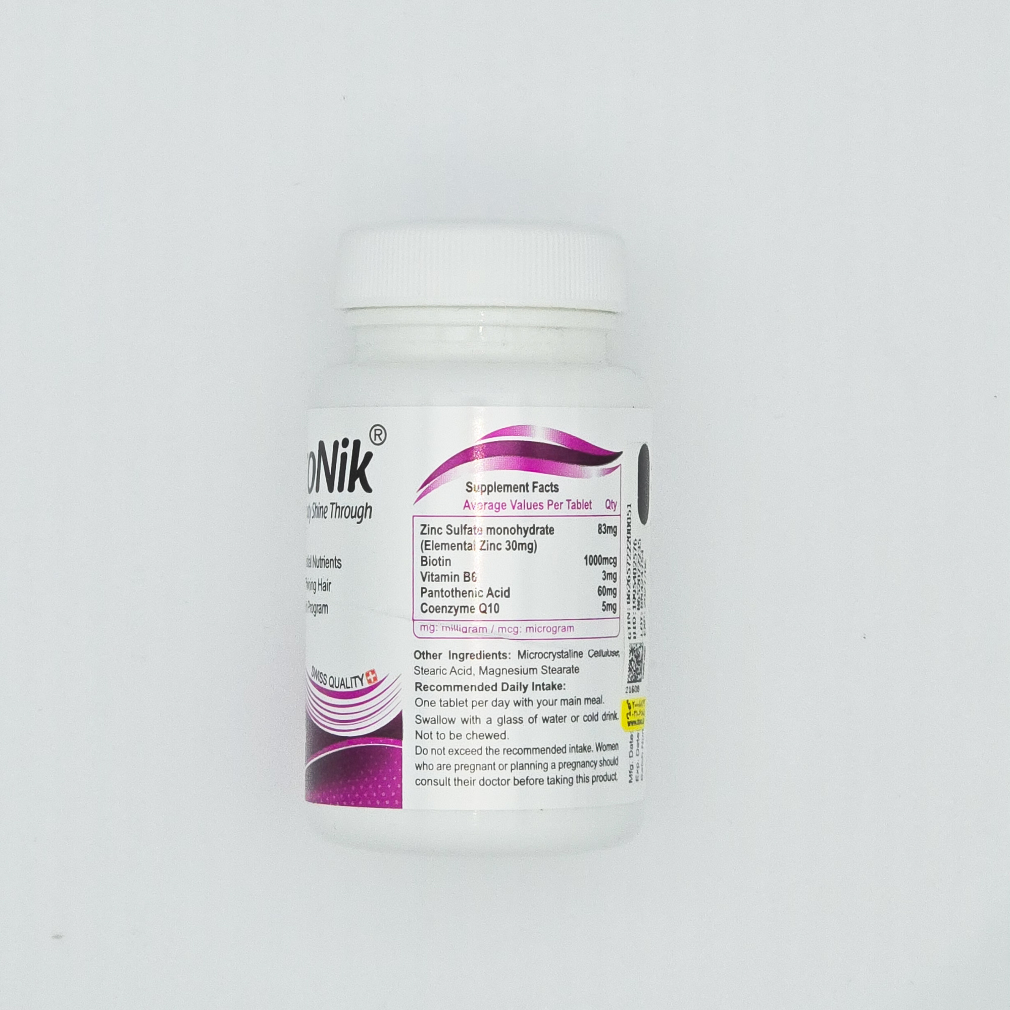 قرص haironik شامل زینک سولفات، بیوتین، پانتوتنیک اسید، ویتامین ب6 و کوآنزیم کیوتن است که در ادامه با اثرات آنها بر سلامت پوست، مو و ناخن آشنا خواهیم شد.