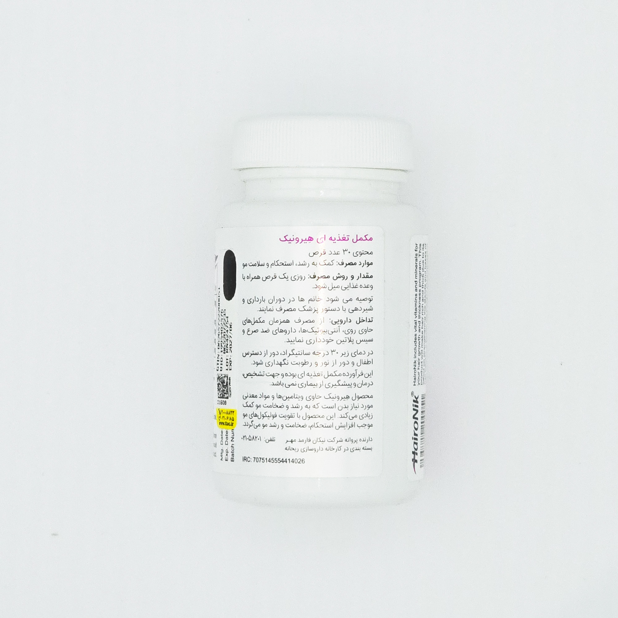 هیرونیک نوعی مکمل تقویتی است که با داشتن دوز مناسبی از بیوتین، زینک و کوآنزیم کیوتن میتواند منجر به تقویت فولیکولهای مو و افزایش استحکام، ضخامت و رشد مو گردد. همچنین قرص haironik میتواند تاثیرات مطلوبی را بر استحکام و سلامت پوست و ناخن داشته باشد.