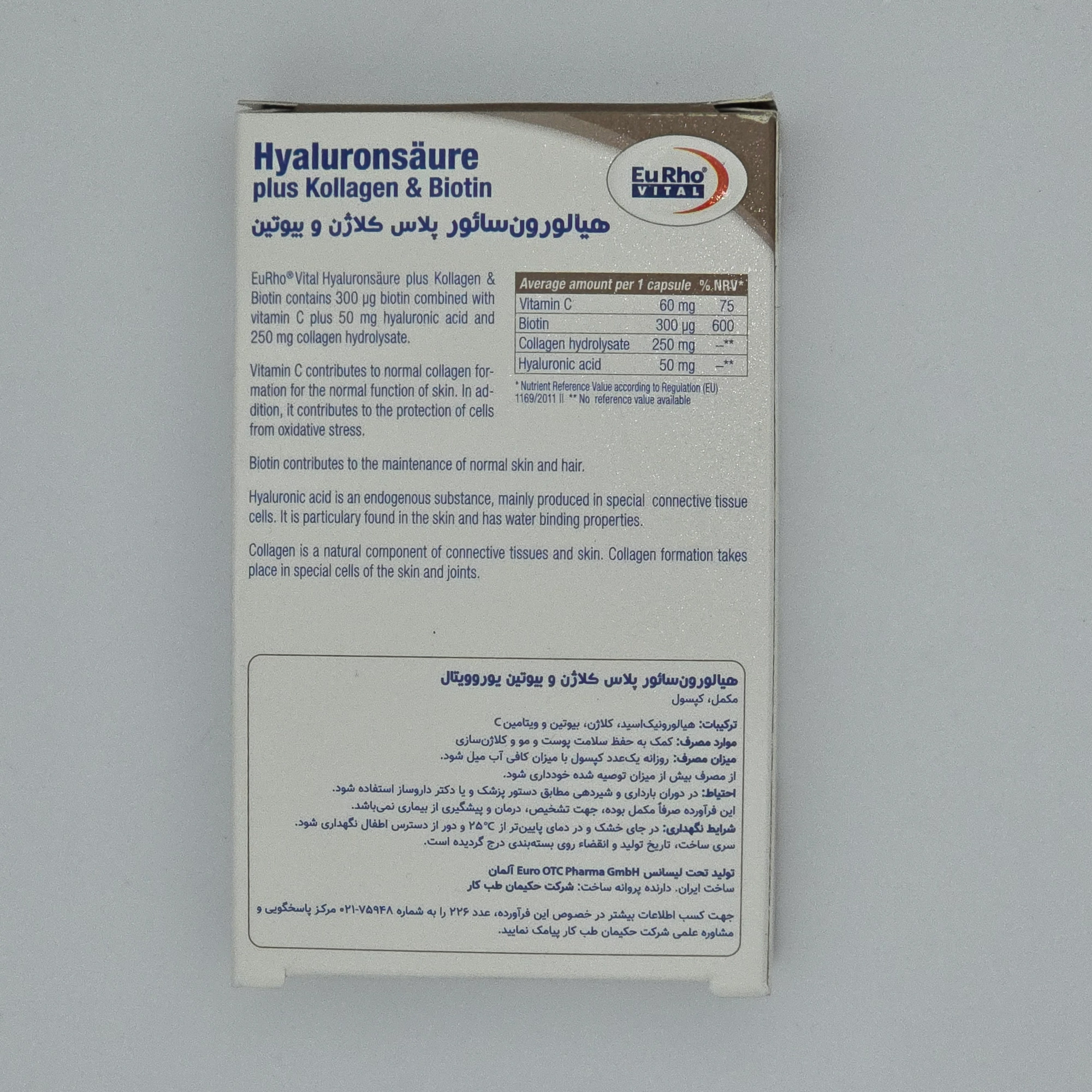 - بیوتین: هر کپسول هیارولون سائور پلاس یوروویتال حاوی 300 میکروگرم بیوتین می باشد. بیوتین یا همان ویتامین B7 یکی از اصلی ترین ریز مغذی ها می باشد که در حفظ سلامت پوست و مو نقش دارد. از همین رو امروزه بیوتین را با نام "ویتامین زیبایی" می شناسند.