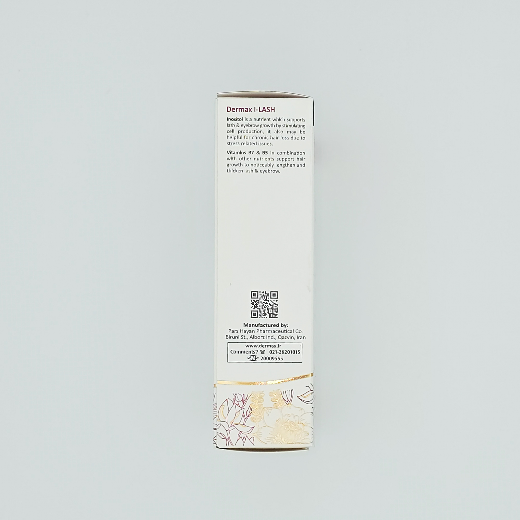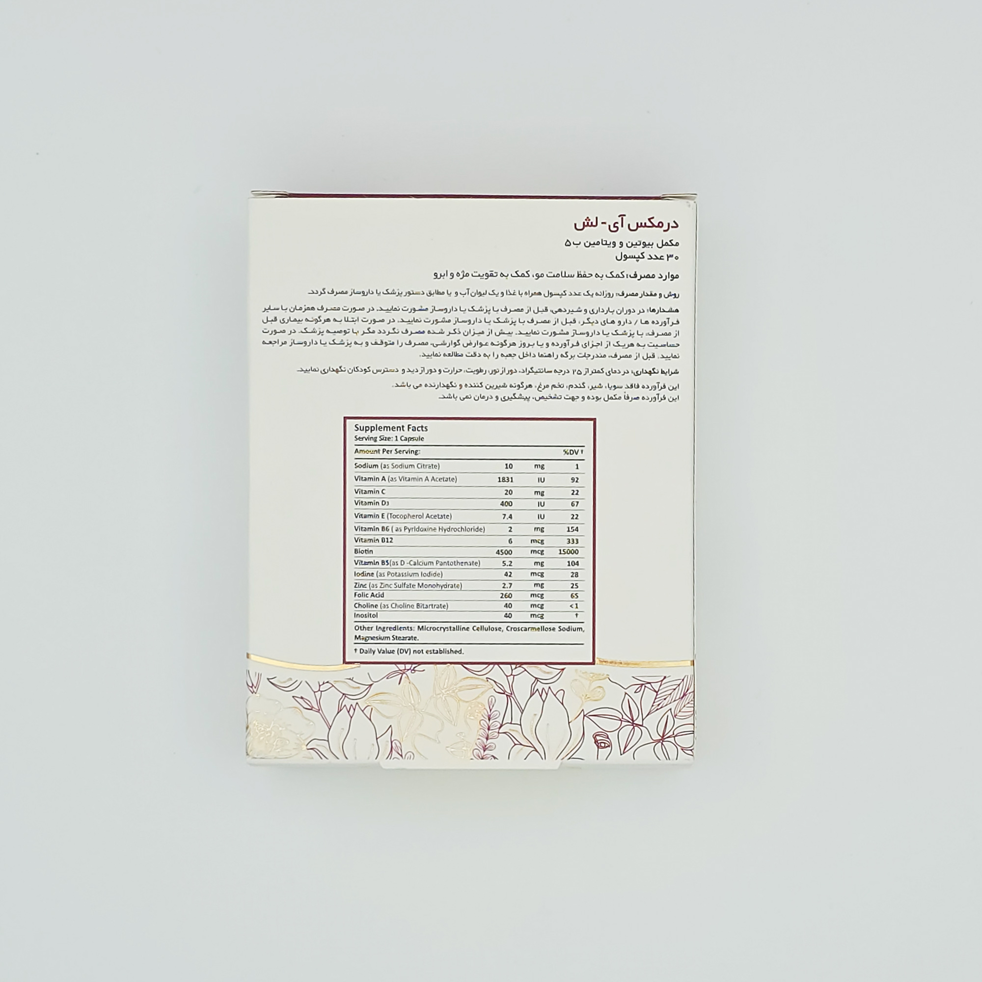 آی لش درمکس، حاوی مولتیویتامین به ویژه بیوتین و ویتامین B5 در کنار مواد معدنی همچون زینک به فرم زینک سولفات منوهیدرات