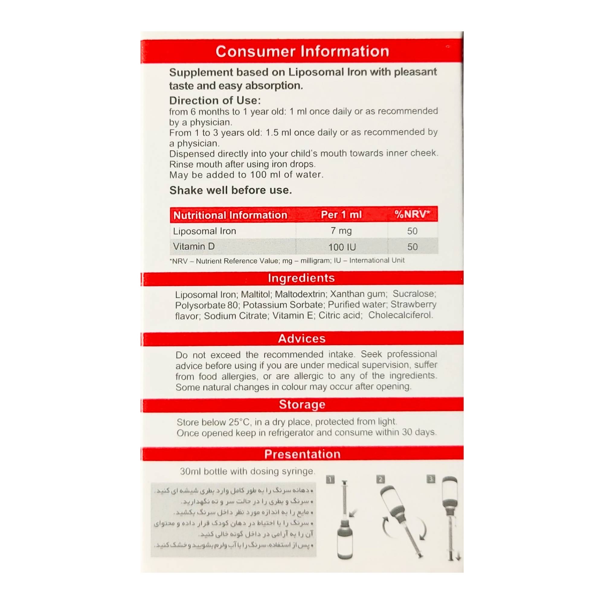 به دنبال مصرف مکملهای حاوی آهن ممکن است عوارضی همچون تهوع و مشکلات گوارشی بروز نماید. لازم به ذکر است که فرم آهن لیپوزومال این محصول احتمال بروز اینگونه عوارض را به حداقل رسانده است.