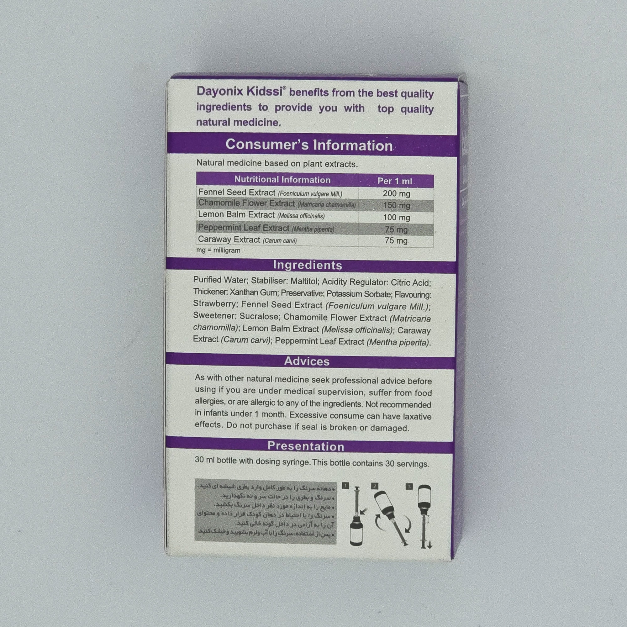 _قطره کیدزی کولیک حاوی عصاره دانه رازیانه، گل بابونه آلمانی، برگ بادرنجبویه، برگ نعنا فلفلی، عصاره میوه زیره سیاه