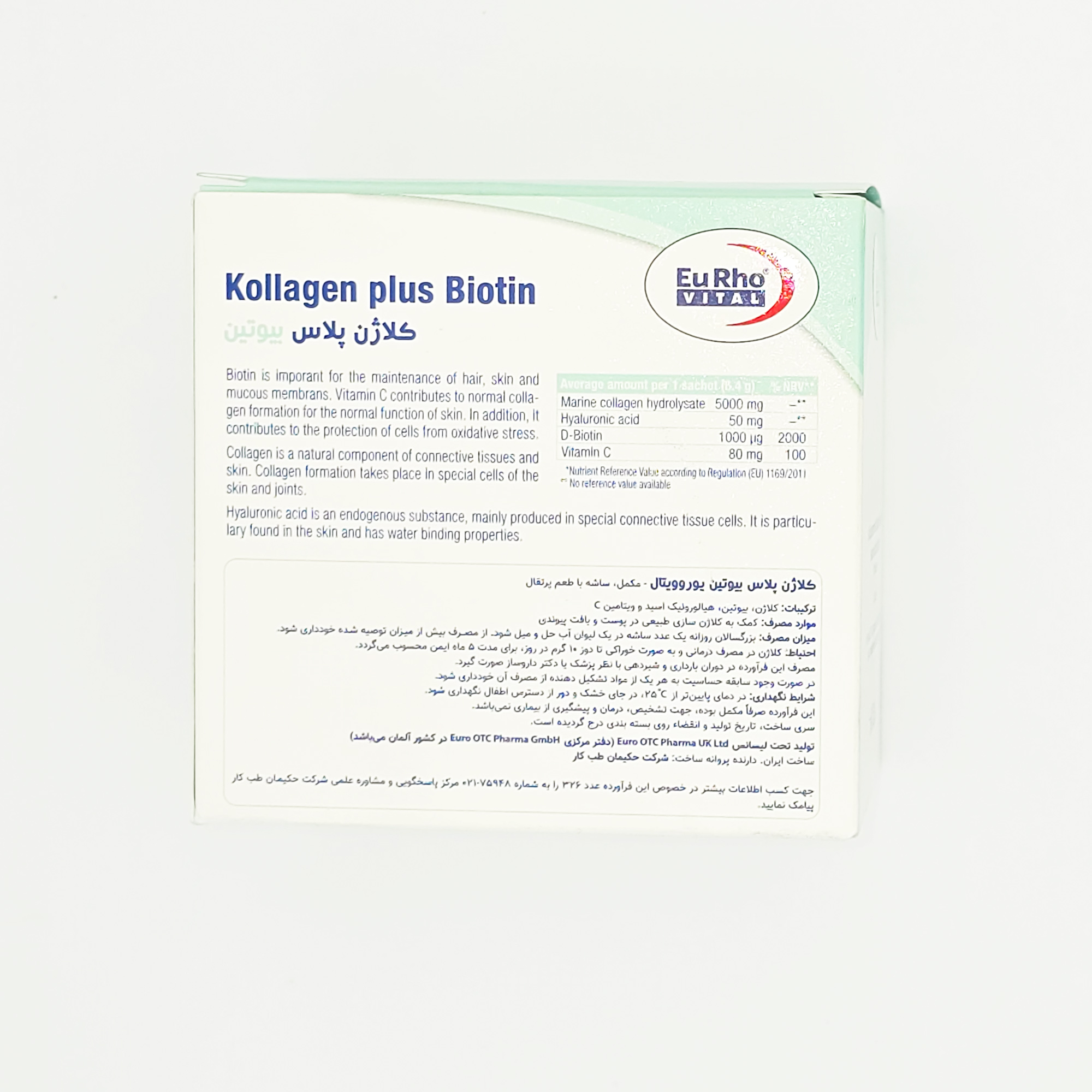 ساشه کلاژن پلاس بیوتین یوروویتال حاوی 5000 میلی گرم کلاژن هیدرولیز شده، 1000 میکروگرم بیوتین به علاوه هیالورونیک اسید و ویتامین ث است. کلاژن پلاس بیوتین داراییک فرمول اختصاصی و مؤثر برای کمک به جوانسازی پوست، کنترل ریزش مو و تقویت استحکام ناخن ها می باشد.