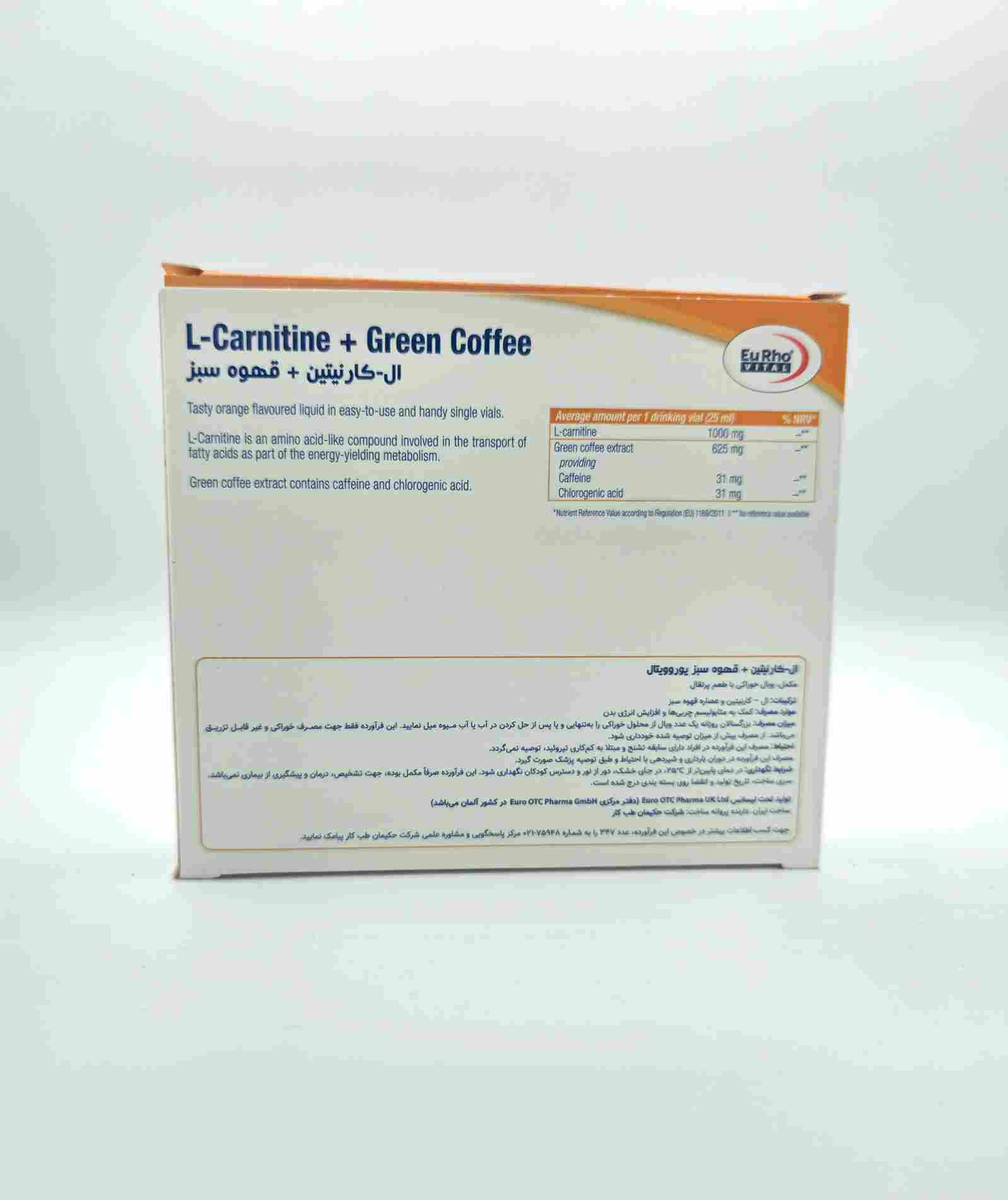 _ ال کارنیتین و قهوه سبز یوروویتال، حاوی 1000 میلی گرم ال کارنیتین و 625 میلی گرم عصاره قهوه سبز در هر ویال
