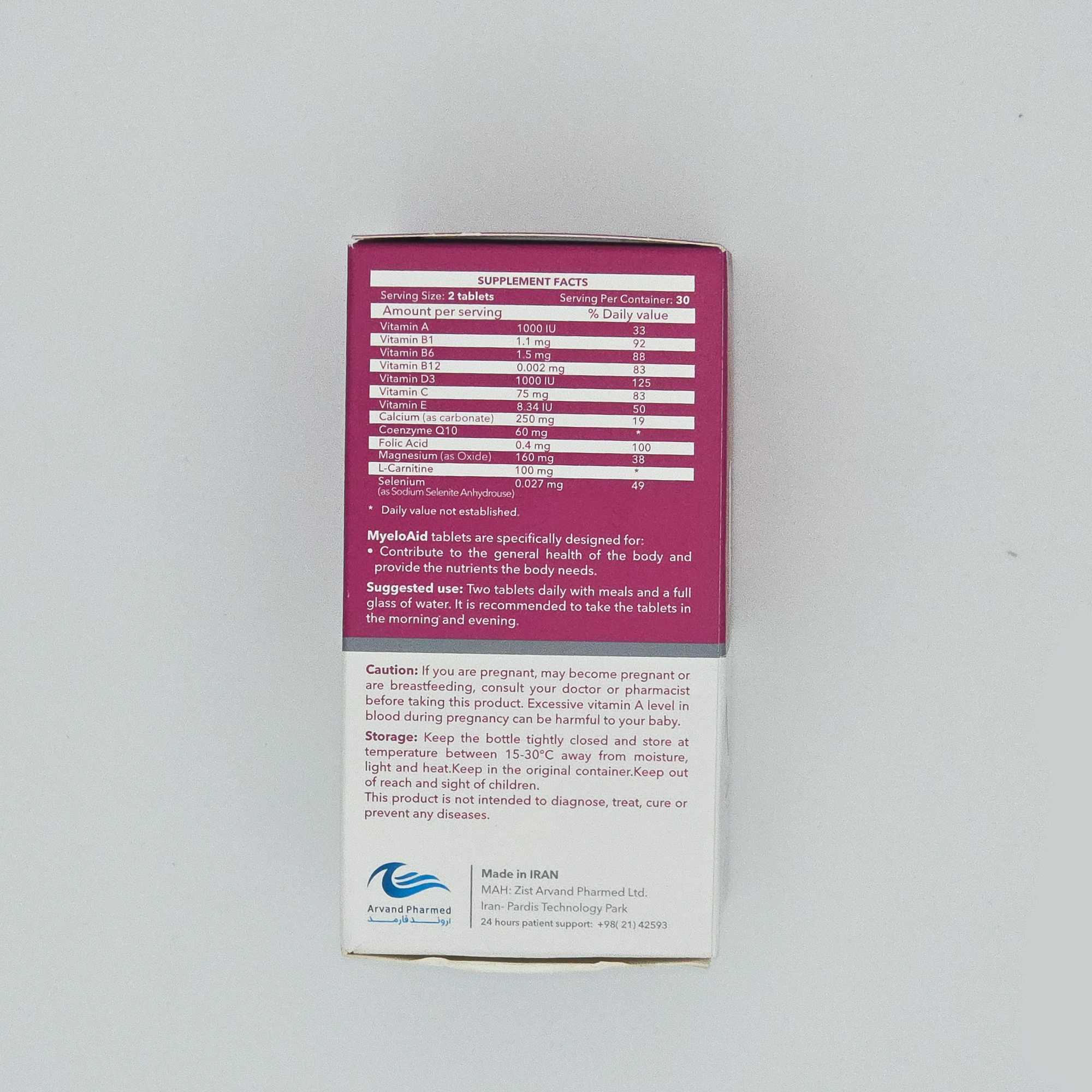 قرص myeloaid با 11 ویتامین و ماده معدنی در کنار دو ترکیب مهم کوآنزیم Q10 و ال-کارنیتین فرموله شده و به عنوان یک مولتی ویتامین مینرال برای ارتقای سلامت عمومی بدن و تأمین نیازهای مغذی می باشد.