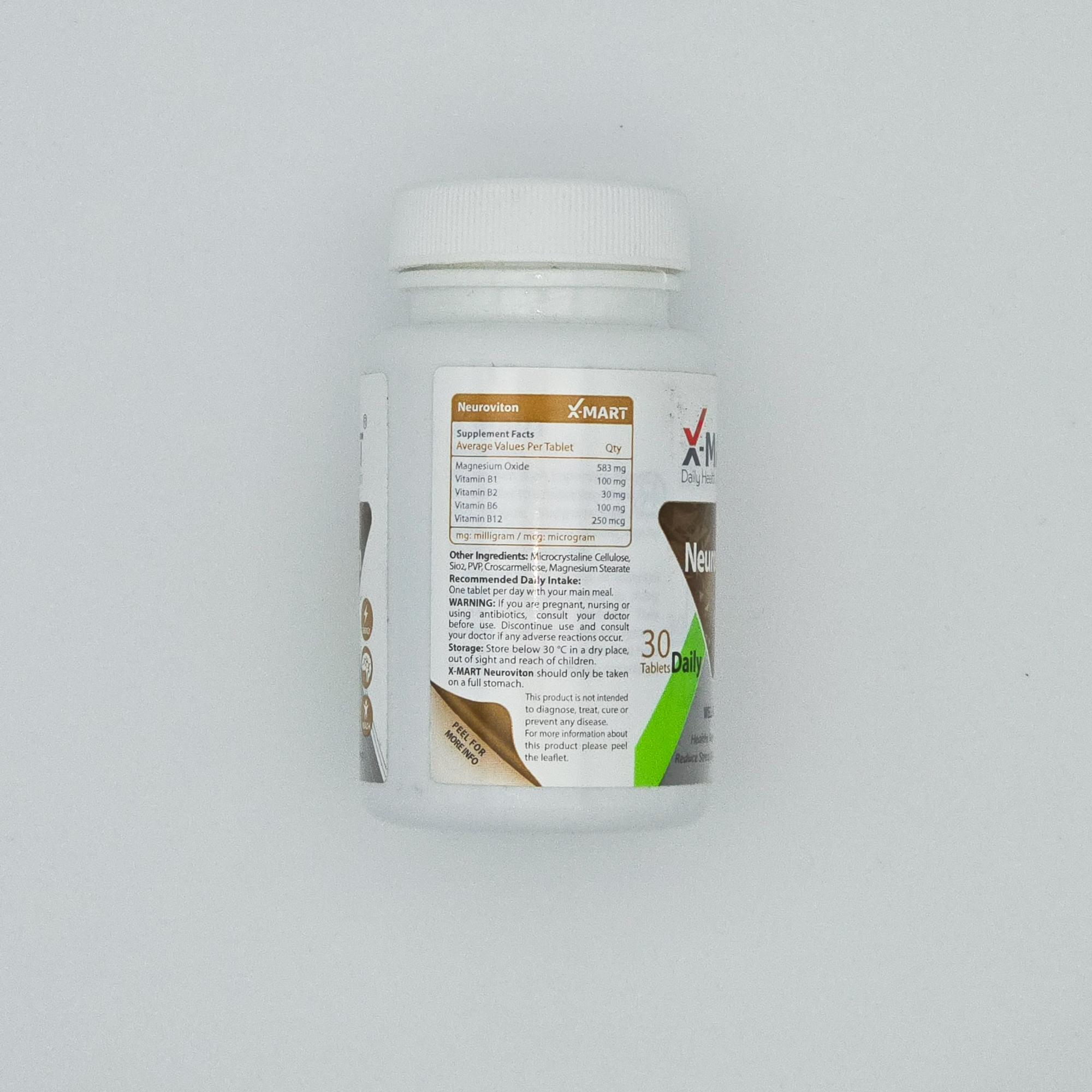 نوروویتون ایکس مارت، مکمل تغذیه ای به فرم دارویی قرص است که برای کمک به سلامت سیستم عصبی-عضلانی کاربرد دارد. نوروویتون ایکس مارت، حاوی منیزیم به فرم منیزیم اکساید در کنار ویتامین های B1 ،B2 ،B6 و B12 است و علاوه بر کمک به سلامت عمومی بدن، به افزایش انرژی، کاهش اسپاسم، بهبود دردهای نوروپاتیک، کاهش اضطراب و استرس، تسکین علائم سندروم پیش از قاعدگی (PMS) و کاهش شدت حملات میگرن نیز کمک می کند. قرص نوروویتون ایکس مارت، در قوطی های پلاستیکی 30 عددی توسط شرکت نیکان فارمد مهر در ایران تولید می شود.