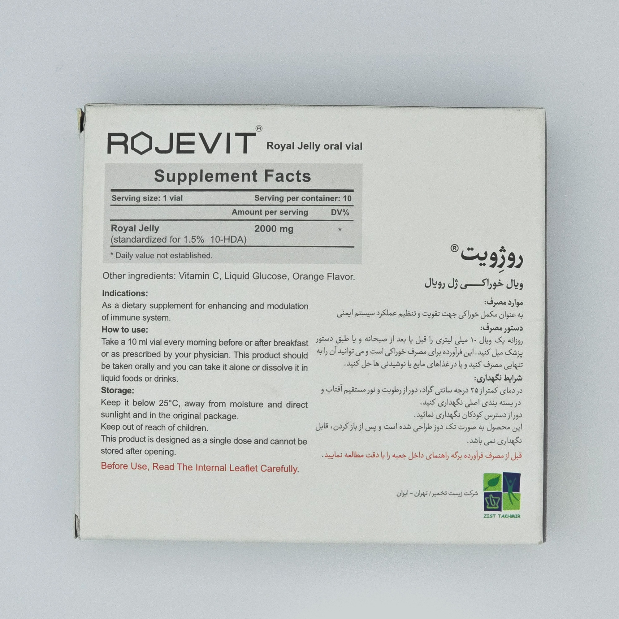 محصول روژویت رویال ژلی ساخت شرکت زیست تخمیر میباشد که در جعبه های حاوی 10 عدد ویال تک دوز خوراکی با طعم پرتقالی به عرضه میرسد.