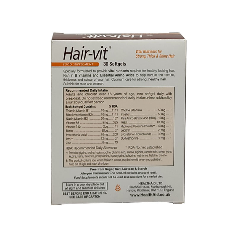آهن جزء اصلیترین ترکیبات به کار رفته در hairvit برای حفظ سلامت پوست، مو و استحکام ناخن است. همچنین در ساخت DNA به ویژه در سلول های مو نقش دارد. در زمان فقر آهن، بدن نمیتواند هموگلوبین مورد نیاز را تولید کند و در نتیجه اکسیژن کافی برای رشد و ترمیم سلولهای بدن از جمله سلولهای تحریک کننده رشد مو فراهم نمیشود. ریزش مو یکی از عوارض کم خونی ناشی از فقر آهن است که با دریافت مکمل آهن برطرف می شود.