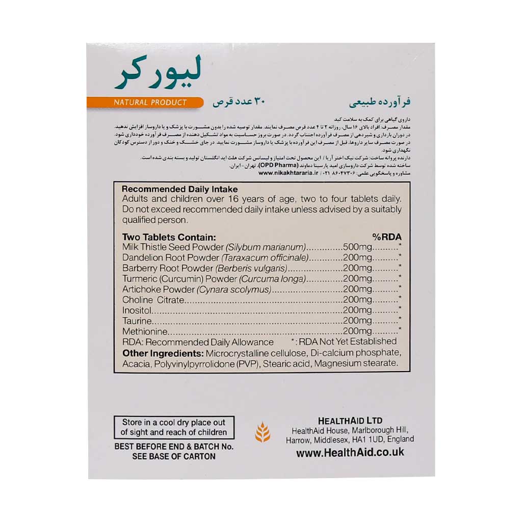 قرص لیورکر هلث اید فاقد شکر، فاقد نمک، فاقد رنگ مصنوعی، طعم دهنده یا نگهدارنده میباشد.